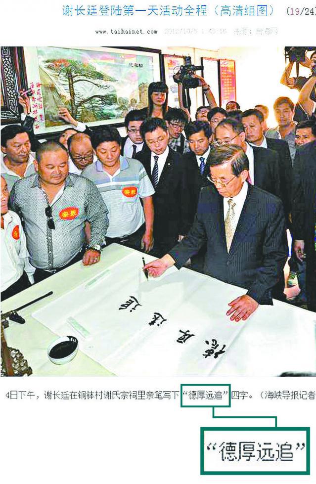 此外,謝長廷前日在福建東山縣銅砵村祭祖後,揮毫寫下「追遠厚德」;不料被內地新聞業者念成「德厚遠追」,彰顯內地年輕人對「由右至左」的傳統書寫模式之陌生。