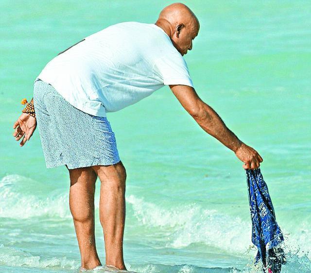 身家有成廿幾億嘅美國音樂大亨Russell Simmons,噚日同佢位環球小姐女友Leila Lopes喺邁阿密享受陽光與海灘,之後Russell仲搵海水沖走條泳褲啲沙。阿叔呀,咁咪越沖越鹹!