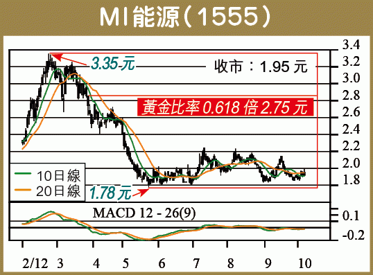 (二)盈利預測或有較大偏差,PB則根據最新實數計算,參考價值更高。MI能源今年6月底每股NAV報1.224元人民幣,折約1.506港元,現價PB 1.29倍,較中海油PB 2.00倍、中石油1.46倍與昆能2.62倍皆有折讓,以4股平均PB 1.84倍為合理估值,MI能源已值2.77元。只要返回今年2月高位3.35元跌至5月1.78元低位,累跌1.57元的黃金比率0.618倍,即可見2.75元,與合理估值脗合。高彰坡本欄逢周三、日刊出