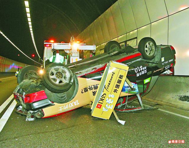 深宵時分,長青隧道實施單管雙程行車。昨凌晨3時50分,一輛空載的士經隧道往屯門,途中懷疑司機打瞌睡越過「火位」,驚醒一刻連忙扭軚返回原線,但卻告失控,猛撼石壆,衝行數米後翻轉,四輪朝天。的士一扇車門甩脫,車頂和車尾均告毀爛,58歲姓黎司機右手受傷,自行爬出車外報警求助。