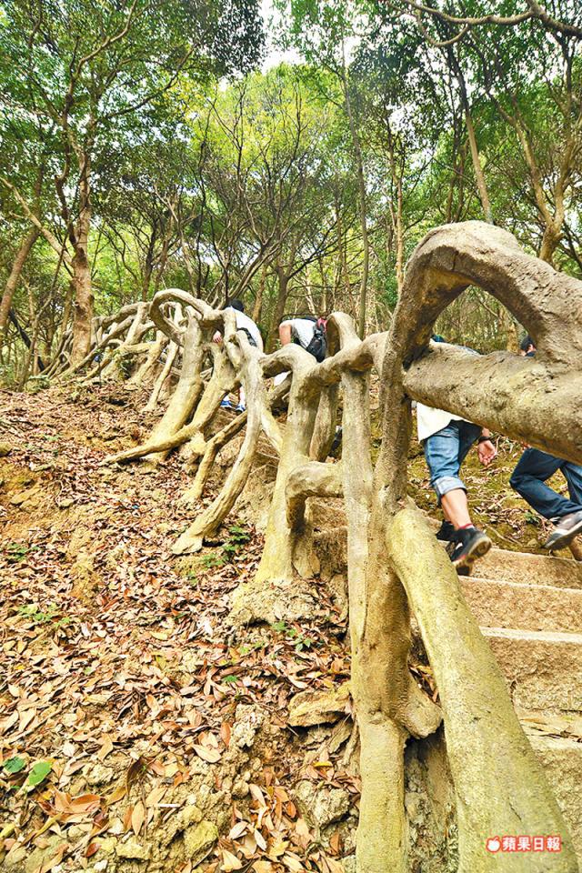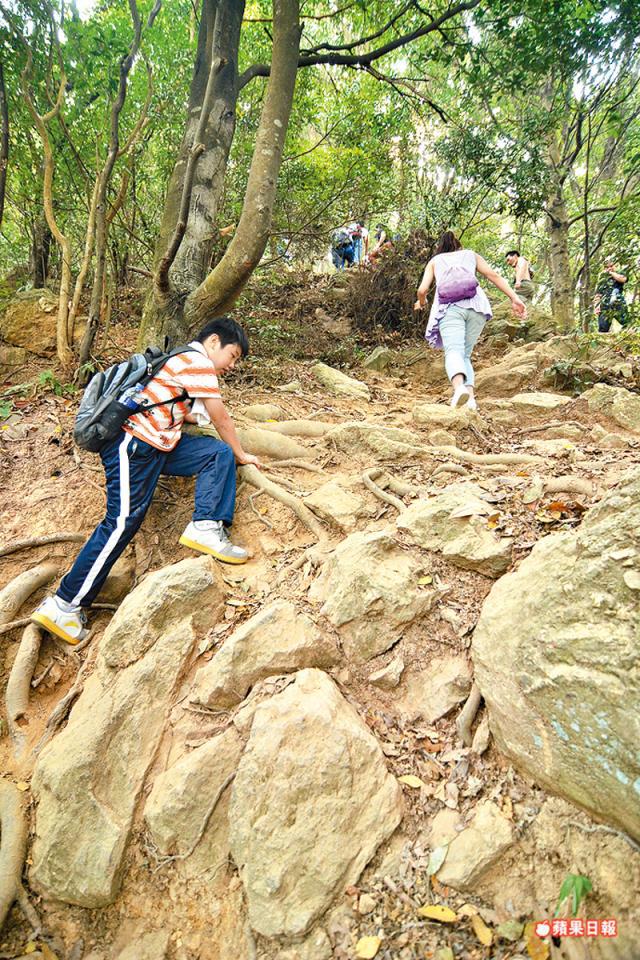 今次我們沿百年古道上山,先走一小段平路,經過水庫後,便正式踏入有45°斜度的路徑上山。山路是大大小小的石頭和樹根,甫行了15分鐘,便已開始氣喘。決定觀看四周分散注意力,環境不算太髒,但每隔一段路,地上就散佈着一兩個空的膠樽,看得出是比我們早上山的人拋棄的。