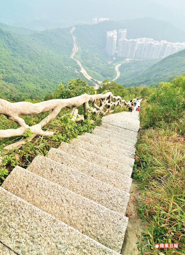 接着可以從盤山公路走到「小梧桐」,整段路是車行的柏油路,非常好走。看到電視塔後,便可走「凌雲道」開展下山的路。告別舒服,又是45°下山,不對,最斜的地方有70°,這次要挑戰的是,永無止盡的樓梯。45°樓梯最妙的地方是,不能放下整隻腳掌的梯級,會方設有欄杆作扶手;相反,只要得放下隻腳,則沒有欄杆,不能不嘆住氣讚打造山路的人,太厲害了!計算得那麼盡,多點扶手欄杆也沒有。