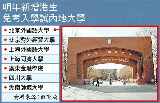 去年起63所內地院校免試招收港生,今年有70所內地大學供港生報讀,比去年多7所,包括培訓中國外交官的北京外國語大學及上海外國語大學等。