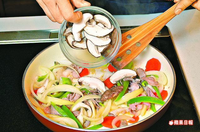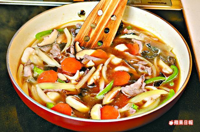 先將洋葱下鍋兜炒至軟後,再下冬菇炒,然後加入其他咖喱汁料煮約5分鐘。