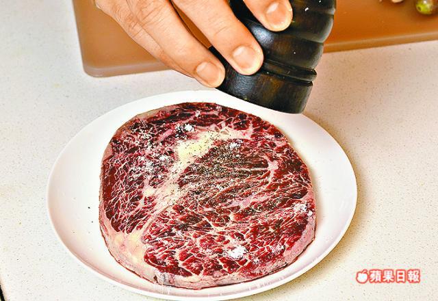 和牛先灑鹽及胡椒,茄子表面幾刀。起油鑊,以中火將和牛每面各煎約1分30秒,在鑊邊空位同時放入小青椒及茄子煎熟。
