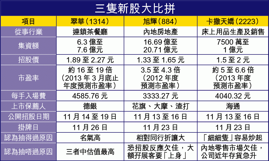 【本報訊】市況回穩,今、明兩日將共有三隻新股「應市」,分別是茶餐廳翠華(1314)、內房股旭輝(884),及床上用品生產及零售商卡撒天嬌(2223),共集資近30億元,專家普遍認為旭輝「博得過」,惟不要用大額孖展認購。