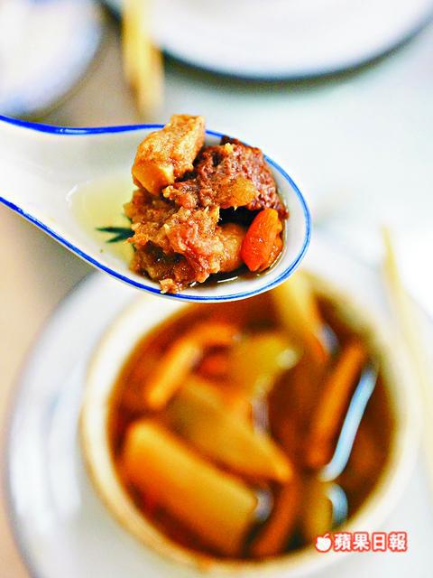 一打開熱辣辣的燉盅,幾乎被淮山、杞子、黨參和紅棗佔滿,撈一下盅底,終於看到四、五粒已被切開的牛鞭。一入口才發現,原來牛鞭的質感很像牛筋,彈牙又有咬口,加上藥材的味道早已滲入了裏面,味道濃郁一點也不覺得奇怪。再喝一口湯,濃濃的中藥味帶鹹,入到肚裏有一種極為暖胃的滿足感,相信在冬天的時候絕對是街坊們的恩物。