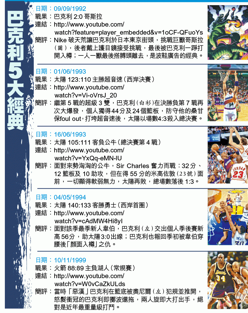 領技犯,與人打架,對巴克利是家常便飯,難怪當年Nike為其度身訂做的廣告,也是他與怪獸哥斯拉1 on 1。到今時今日,擔任球賽評述的巴克利一樣在電視上大放闕詞;但在「插水」也要被罰的乖乖NBA,我們都懷念巴克利的一張嘴!