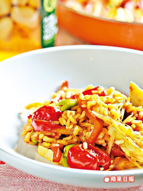 Paella米150克、紅洋葱/茴香/紅、黃燈籠椒(切條)各半個、蒜頭(剁碎成茸)2瓣、些利酒50毫升、水300毫升、車厘茄(切半)10顆、油浸雅枝竹2件、冷藏蠶豆50克、意大利番荽(剁碎)1湯匙、檸檬1角、煙紅椒粉半茶匙、番紅花絲少許、鹽/黑椒碎/初榨橄欖油各適量