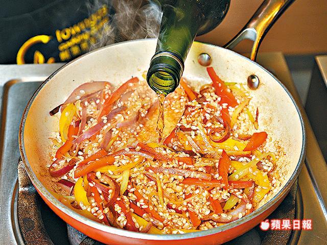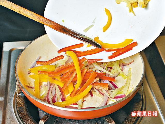1.平底鑊燒熱油,炒香紅洋葱及茴香,加入燈籠椒絲炒1分鐘,加入蒜茸兜炒。