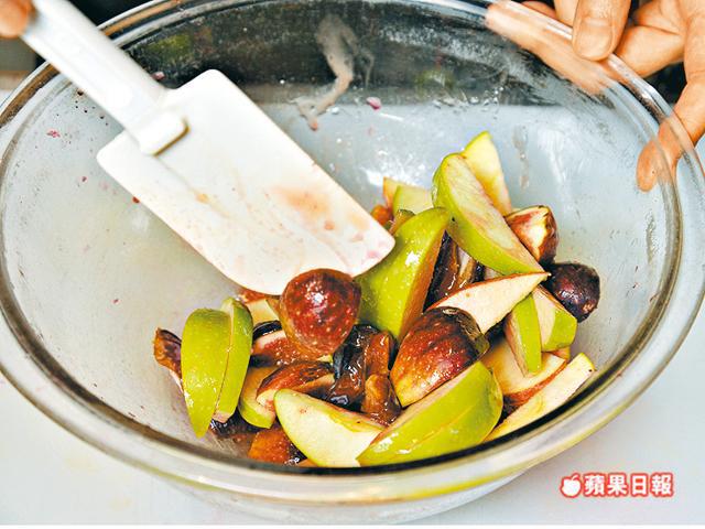 新鮮無花果4個、以色列蜜棗(去核)4粒、紅石榴半個、青蘋果(切條)1個、合桃(烘香)2湯匙、