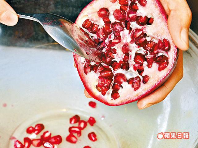 1.半個紅石榴,敲打外殼把內裏的籽取出。