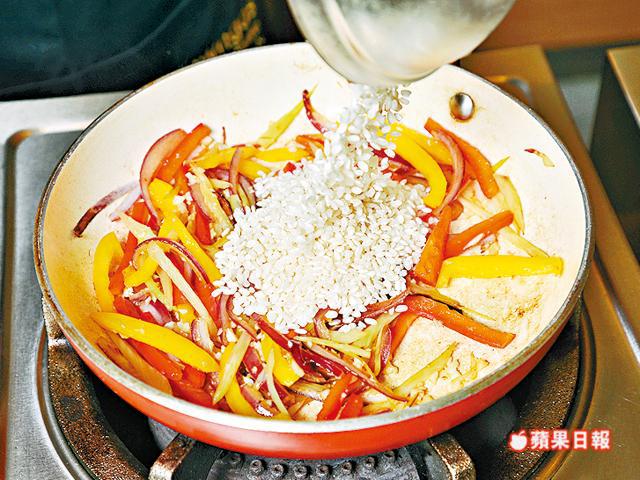3.加入足夠水份浸過米面,加鹽和黑椒碎調味。調細火煮至水份被差不多完全吸收,留意期間不可攪拌。