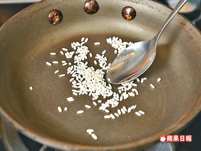 1.生糯米用白鑊烘至金黃色,待凉後磨成粉末,備用。