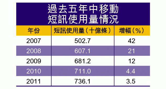 事實上,中移前董事長王建宙就曾說明,內地的科技公司不斷騎劫中移動的盈利,但如今李躍開名批評,顯然對騰訊旗下的微信大行其道感到不滿,翻查資料,中移在其他即時通訊程式影響下,每年短訊使用量增長持續放緩,由2007年度增長42%,至去年度僅微增3.5%,2007年短訊收入佔集團近12%,至2011年,旗下短訊收入加上彩信收入,佔收入的比例也只有8%。