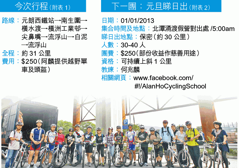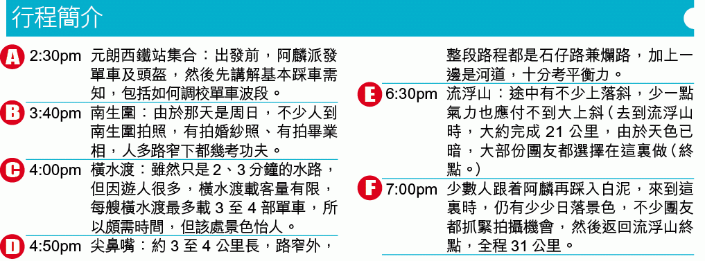 阿麟去年首次籌辦單車攝影團是元朗文物徑,算是無甚難度的路線,第2次是去東涌機場跑道影飛機;今次第3團,吸引約20人參加,特色有南生圍靚景、橫水渡,還有一段爛路(見附表1),Yvonne就是在那段爛路「炒車」,跌損下巴,幸好只是輕傷。