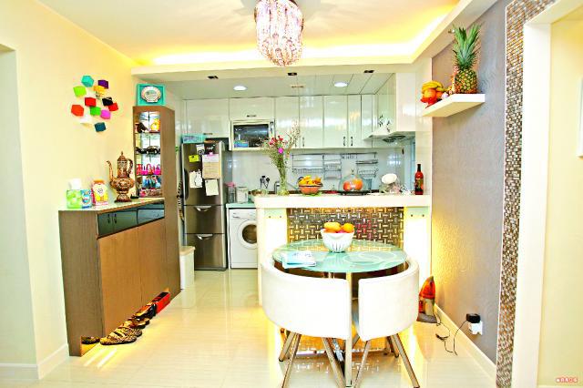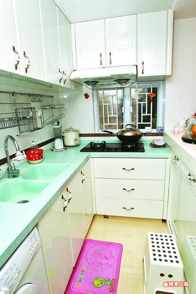 對於喜歡大廳感覺的用家,將600餘方呎三房一廁間隔的廚房改為開放式頗為普遍,如介紹單位般,開放式廚房與飯廳之間訂造高身吧枱,觀感開揚而且富現代感。單位裝修落本,包括水喉電線以至窗框俱已換新,連同全屋華麗用料設備,花費逾50萬元,保養如新。