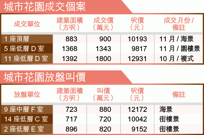 名采策略姚雲龍表示,城市花園活躍放盤約60個,海景單位呎價平均約1.1萬元,園樓景戶平均呎價亦達1萬元。政府推出新辣招後,屋苑市況膠着,普遍準買家還價幅度達10%或以上,惟放盤業主接受的議價幅度僅約5%,買賣雙方呈現拉鋸狀態,導致交投大幅萎縮。