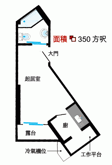 350方呎的多邊形單位,竟然沒有預留位置放床。每呎萬元的單位只能放張梳化、掛個薄電視,不愧一代奇則。圖片來源:地產小子網誌