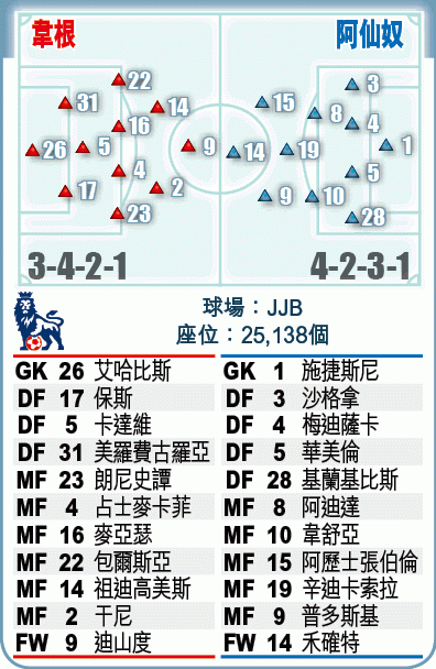 在上場對諾域治的比賽中,韋根中堅比斯古觸傷鼠蹊,要休戰10周,幸好艾卡拉斯、卡達維及拉米斯3名後防傷兵都有望痊癒復出,可以頂替比斯古的位置。中場占士麥卡菲足踝有傷,但經掃瞄後情況不太嚴重,今仗亦可望披甲,加上干尼、祖迪高美斯及迪山度等戰將,前線陣容完整。不過,韋根最近防守欠穩,近7仗比賽無論戰果如何,場場都至少失兩球,所以在數據上,韋根今季聯賽有逾7成的比賽總入球數達3球或以上。