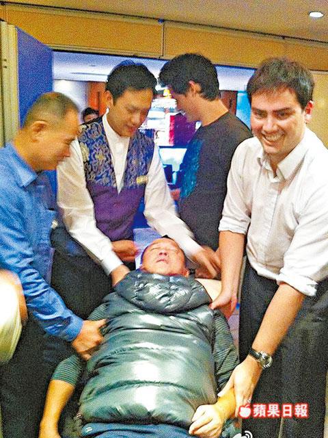 譚詠麟母親大壽,志偉爛醉,要眾男打橫抬走他。