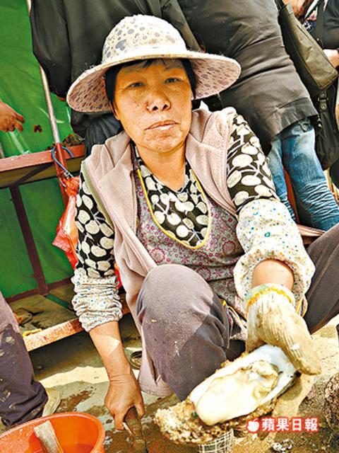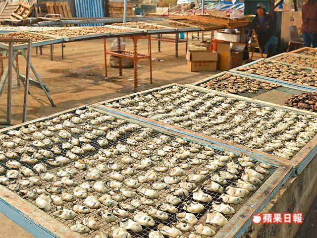 走到流浮山正大街的盡頭,一定會看到很多一排排生曬蠔豉,或見不少人一家大小買一些生曬蠔豉之類回家,走到最末端,就見陳太的檔口經常人頭湧湧,「你知道嗎,發哥都很喜歡來這裏,不過不是來買蠔,是來拍照,影日落,他姐姐更試過每天來,不過講真,好多明星幫我買蠔或者買蠔豉,你一講肥仔檔就無一不知了,因為我們這些蠔全部都是原產自流浮山的,從養蠔、採蠔、洗蠔、曬蠔都親力親為。我們在岸邊養蠔,會先在岸邊飼養兩年,再把長大的蠔掛在蠔排裏繼續飼養,由於該處是鹹淡水交界,海中的微生物豐富,蠔會長得更快更肥美。每日早上五時,就坐漁船滿載生蠔回來,然後就開殼、洗蠔,如果沒有人買生蠔就拿去曬,曬乾就賣,每年農曆九月開始生曬,到年尾便可食用了。」沿途亦可以見到不少居民在洗蠔或者曬蠔豉,居民把養成的蠔起殼後便把殼棄置於海邊,形成一個個蠔塚,到處可以見到堆積如山的蠔殼,數量可能有上百萬之多,蠔塚的深度早已超過我們的身高,視線範圍之內除了蠔殼,還是蠔殼,形成一番獨特的景色。