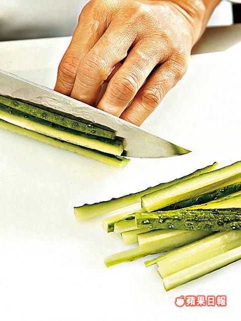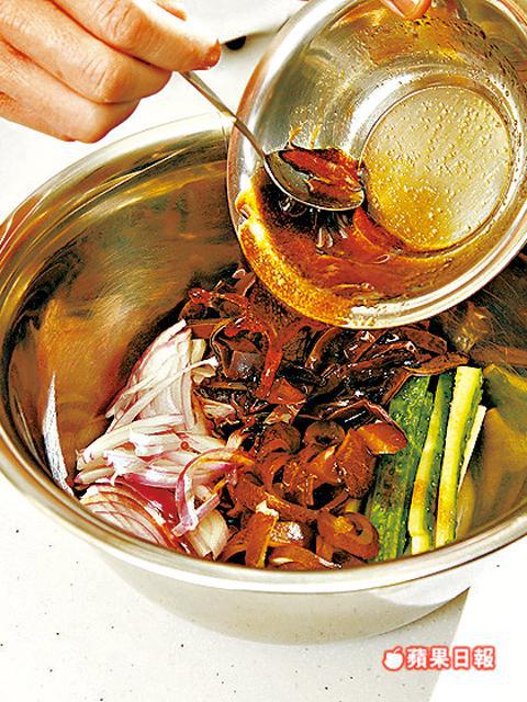 海參多用作中菜,Denice搞搞新意思,以之配合維他命C豐富,具有美白、抗氧化功效的青瓜及黑木耳,做一個簡便的西式沙律!她說一定要用日式的米酒醋,因較清甜,混和檸檬汁,酸甜味剛剛好!
