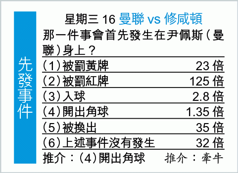 英足盃輕鬆晉級之後,曼聯在今晚回到英超賽場迎戰修咸頓。尹佩斯等主力皆在上仗免戰,唞夠出擊更添大勝本錢,熱捧曼聯[-1]「主勝」(球賽編號:星期三16;有線200及300台明日4:00am直播)