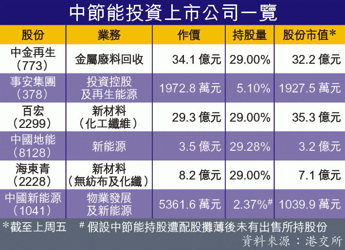 中國節能環保集團於2010年由兩家央企中國節能投資、及中國新時代控股重組後成立,主要從事節能、環保、新能源領域技術研發、項目投資及建設營運。市場早有傳聞,本地一名影響力極大的投資者與中節能管理層相熟,相信不少投資都是經這名投資者作中間人,事實上,中節能最先在港的投資,是前稱福邦控股的中國新能源(1041),當時投資額只是數千萬元。