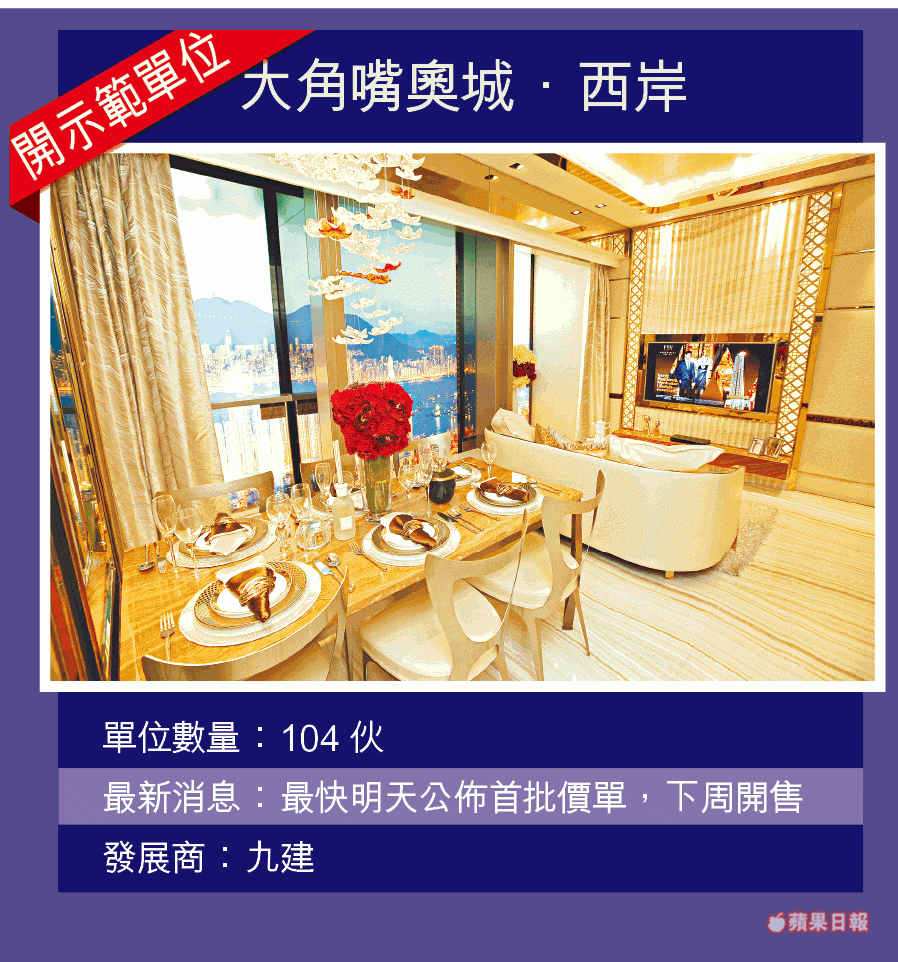 九建(034)的奧城.西岸昨已上載樓書,今日開價,趕下周發售。有指該盤為營造抵買,除建築期付款的首期由三成降至兩成外,即供折扣亦由8%擴至10%。該公司市務及銷售部總經理楊聰永表示,該盤樓花期長達近40個月,故特別為投資客推出超長成交期照定價付款方法。買家在簽署臨時買賣合約後先付10%,另10%樓價則在簽署正式買賣合約30天及60天後繳付,即入伙前只須付兩成首期,餘下80%樓價可於2016年3月入伙時付清。