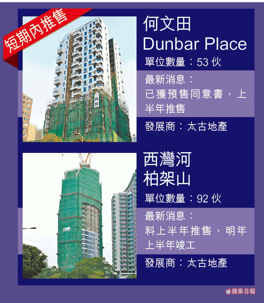 【本報訊】九龍新盤大戰快將爆發。在港產量不多的太古地產(1972),計劃上半年賣兩個市區項目,包括豪宅區內的何文田Dunbar Place及西灣河柏架山。九龍建業(034)的大角嘴奧城.西岸,亦趁一手市場升溫推盤搶客。