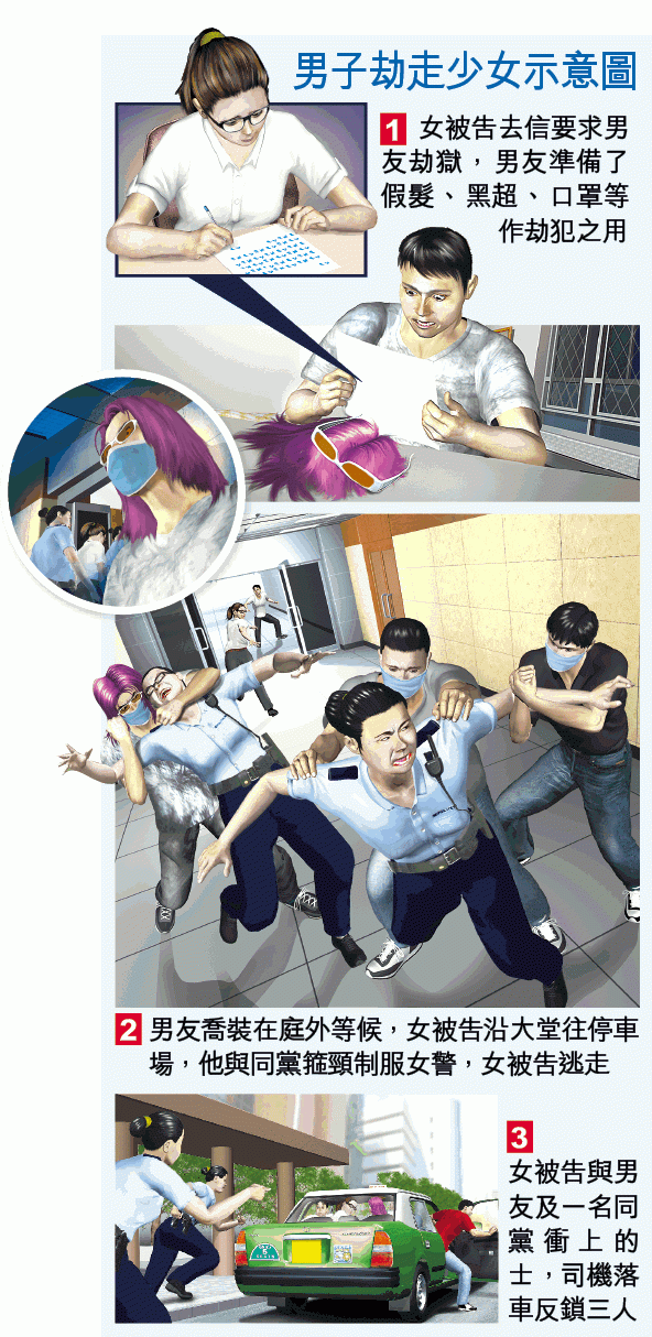 身形嬌小、染有一頭金色長髮、架膠框眼鏡的女被告一臉稚氣,現年16歲的她與31歲男友陳士傑昨分別承認一項從合法羈押逃脫罪。陳表現激動,眼泛淚光,相反女被告表現冷靜。協助劫獄的19歲被告黃偉健及兩名15歲被告,獲控方接納承認刑責較輕的拐帶少年罪。花名「爆炸」的陳有8項刑事紀錄,包括4項與未成年少女性交及3項盜竊案底,他前年就藏毒被判緩刑,因此案違反緩刑令。