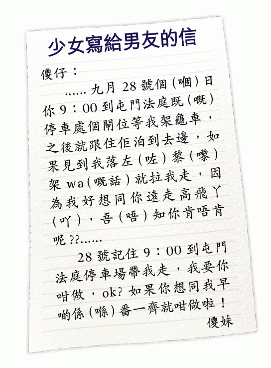 女被告還柙期間,曾撰寫三封信寄到東堤小築給陳。第一封與陳談天,第二封向陳訴說還柙苦況,要求陳帶她走,第三封信說「好想同你遠走高飛」,要求陳9月28日早上在法院停車場等她,趁她落警車時拉她走,還提醒陳當日要喬裝到庭,以免遭她的家人認出。