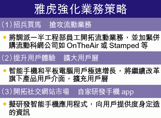 此外,邁耶也重視用戶急速增加的流動裝置市場。邁耶表示公司計劃調派半數工程師,拓展流動業務。與此同時,雅虎也非常重視與其他科網企業的伙伴合作關係,例如雅虎目前為蘋果iPhone的語音搜尋服務Siri提供數據,還有三星電子智能電視,讓電視用戶可瀏覽雅虎網頁內容。