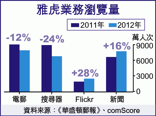 儘管雅虎提出產品革新,資料指電郵和搜尋器用戶瀏覽量分別按年下滑12%及24%。分析指,雅虎也要兼顧跟facebook、蘋果和亞馬遜涉獵網上搜尋業務挑戰,故重登市場之首過程非常漫長。