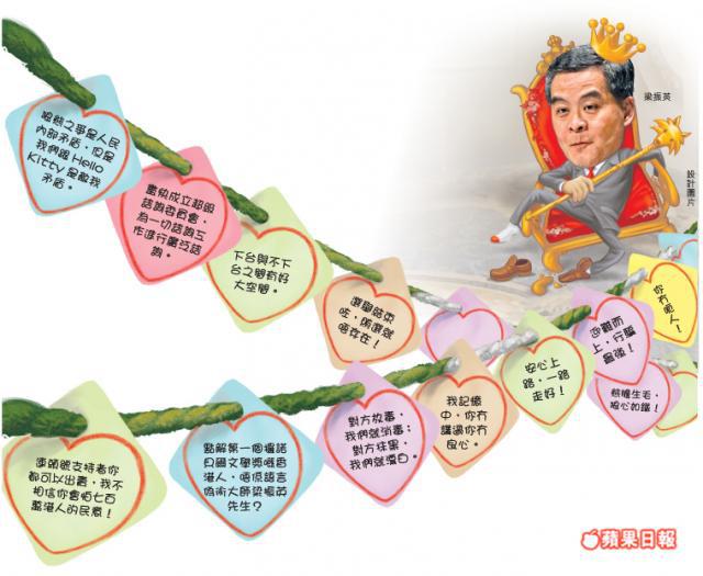 狂掃689票當選特首嘅梁振英,為咗制止「食碗面、反碗底」嘅灰熊晉身尊貴嘅全國政協常委同行政會議,寧願犧牲誠信都要反口,高尚情操贏得「愛港之聲」成員力撐,噚日喺政總掛起一張張心意卡,為振英同志打氣。
