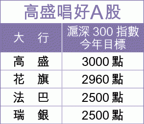 滬綜指昨收報2385點,升0.1%,但深成指則回軟1.2%,報9667點,兩地全共成交額約1,200億元,較上日減約8%;累計整個1月,兩地指數齊齊彈升約5.1%。高盛兩個月前唱始唱好A股,大市至今彈升逾兩成,該行昨因而上調滬深300指數目標,並上調全年企業盈利增長5個百分點至16%,預測市盈率(PE)由10.7倍上調至11.2倍。