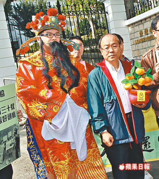 【本報訊】多個團體趁昨日年初二,遊行到禮賓府及政府總部向特首梁振英「開年」。社區組織協會(社協)聯同十多個中港分隔單親家庭成員,由遮打花園遊行至禮賓府,促請政府實施一年多簽探親政策,並酌情加快批出單程證,確保家庭團圓;民協則帶同「財神」到禮賓府「送桔」,批評梁振英的施政報告對扶貧欠承諾,並寄望月底發表的預算案還富於民。