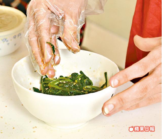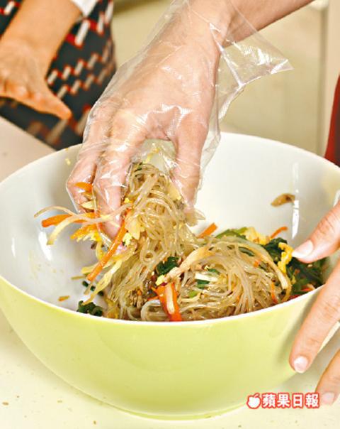 「在古代,韓國人對於年夜飯非常講究,因為所有飯菜一律為傳統飲食。而上一代的老爺奶奶會在這時試一試媳婦們的烹調手藝,也成為各家衡量『好媳婦』的重要標準。不過近年,這習俗也慢慢改變,年輕媳婦們為了減輕負擔,有時候也會在食品公司或各大超市購買,甚至事先預約送貨上門,不過我媽媽不相信超市的食物,我們手藝也全部來自我媽媽。」今天Youmi就教Ana做韓國人新年必食的炒粉絲,以前我認識一些韓國人,他們告訴我炒粉絲是一樣很特別的傳統菜,因為他們覺得粉絲要炒得好吃,一定要在家裏吃,在餐廳往往不能吃到那種味,Youmi就笑着說:「對啊!我們韓國人真的這麼說,因為我們相信做飯時一定要用雙手來醃食物或者撈食物,譬如說這個炒粉絲,我會先用鹽來炒一炒紅蘿蔔、雞蛋等材料,但好像菠菜,我媽媽說一定要用手撈芝麻油才會好吃!」原來Ana也有聽過婆婆跟媽媽這樣說,她們說一雙手可以改變所有食物的味道。