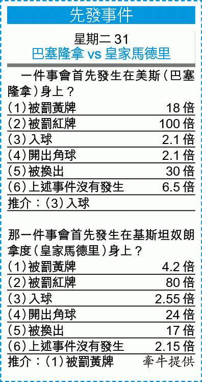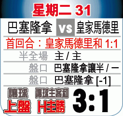 西班牙國家打吡戰二連擊,周二進行第一回──西班牙盃準決賽次回合,由巴塞隆拿主場對皇家馬德里;兩軍上場聯賽均有保留,但以近期盃賽交手,巴塞較為佔優,讓半/一仍宜取上盤。(球賽編號:星期二31;now632台明日4:00am直播)