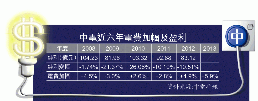 中電昨亦首次向政府清楚表明,若今年進行的中期檢討修訂有欠公平或偏頗,中電將不會接受,態度高調強硬。中電總裁包立賢指,今次檢討是要經中電及政府雙方同意才可作出改動,指若修訂有違管制計劃協議,中電是不會接受。中電已連續四年加電費,受惠於利潤管制計劃,其香港業務去年盈利仍能按年升5%至66.54億元。證券行大摩去年曾估計,中電未來五年會加價40%。