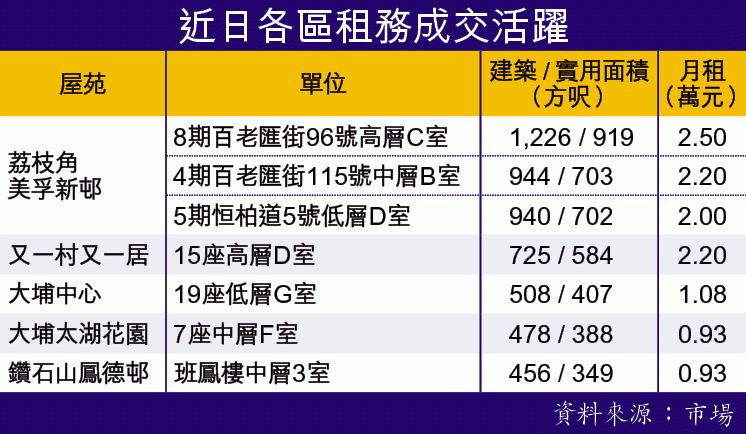 大埔區租務同轉活躍,過去周六日連環錄近10宗租務成交,較出招前平均每周六日僅2至3宗,急升4倍。大埔中心速錄5宗租務個案,19座低層G室,建築及實用508及407方呎,月租1.08萬元,實用呎租26.5元。荔枝角美孚新邨日前1日錄3宗租務成交。富誠地產營業經理林柏榮指,一名租客日前以月租9,300元承租鑽石山鳳德邨班鳳樓中層3室,建築及實用456及349方呎,1房,實用呎租26.6元,打算租一年再作決定。