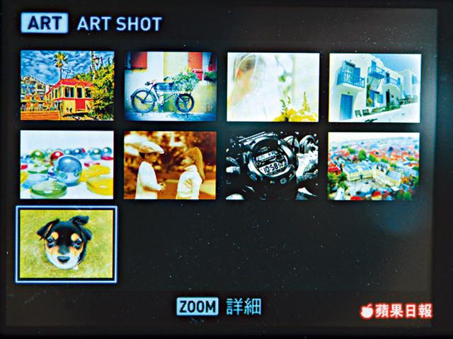若嫌齋影相太悶,ZR400除可拍高清影片外,還可以非常「玩嘢」!機身內置九種濾鏡效果,竟可套用在拍片時使用;而筆者更愛上30-240fps超慢鏡拍攝模式,能以慢鏡重播狗仔的每一個動作,播片時利用左右鍵,在正常30fps播速與240fps慢速之間轉換,影片就會有時快時慢的效果,完全在相機內完成,即拍即睇。其他拍攝功能還包括前清後矇的散景,360°全景一掃、美顏模式,並且支援Eye-Fi及FlashAir WiFi SD卡,是近期一部實用同趣味兼備的相機仔。