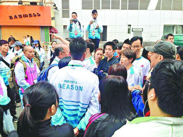 參加最後一組起步的10公里參賽者MiMi向本報投訴,前日早上8時開跑,她在7時56分到達位於興發街的檢查站,望着起跑區,卻被大會人員攔着,並指「所有人唔過得,去到都冇得跑」,引起在場逾百人不滿,「你畀我哋寄存行李,但又唔畀跑」,大會人員組人鏈防止他們強行進入起跑區,並拍下現場情況。