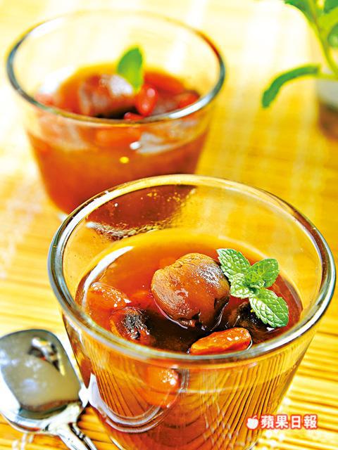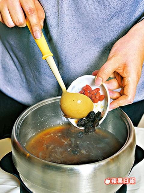 海燕窩(已浸發)50克、黑糖65克、桂圓肉20克、水350毫升、薑汁2茶匙、杞子(已浸軟)少許