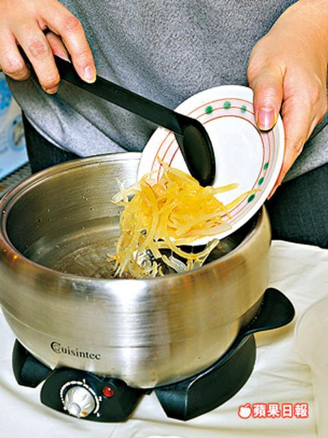1.將海燕窩和水置小鍋中,慢火煮至海燕窩完全溶化。