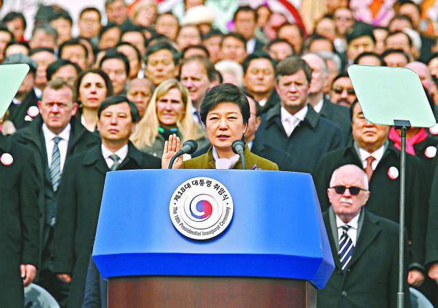 朴槿惠的就職禮,在國會議事堂廣場舉行。她宣誓就職後,發表15分鐘就職演說,指南韓人面對全球經濟危機和北韓核威脅,必須齊心協力,再創猶如韓戰後由廢墟變成發達國家的「漢江奇蹟」。她承諾致力創造新職位、推動創造型經濟,又暗示會管制壟斷經濟的財閥。