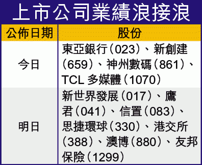 大市昨稍見反彈,但上周五收市後至昨午公佈業績的13隻股份中,好壞表現差半,但有六成股份昨卻報跌,當中萬科置業(1036)、首都創投(2324)及黛麗斯(333)等,跌3.9%至7.5%,沽壓不輕。部份今年大積弱股份則先震倉後喘穩,如第四季業績按年大跌36%的百盛(3368)昨開市後一度勁跌約3.7%,但收市倒升3.9%,累計今年仍跌逾18%;玖紙開市不久即插逾7%,收市則漲3.8%,累計今年則跌6.3%。