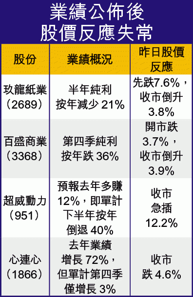 【本報訊】放榜高峯殺到,惟剛派業績股份的股價反應極難捉摸,去年業績報升股紛紛下跌,業績報跌者反而股價造好,即市走勢更加Chok到暈,落場短炒也可明贏變輸。其中,玖紙(2689)去年少賺兩成,股價狂插7.6%後,倒升3.8%收市,假盈喜變真盈警的超威(951)亦狂瀉逾一成。