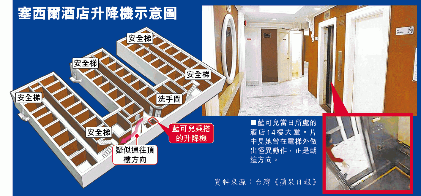 記者出發前網上預訂酒店房,抵埗後竟巧合地獲安排入住藍可兒最後出現的14樓。記者心頭一震:「這也太巧了吧!」酒店由三幢樓組成,呈「E」字形,共700間客房,但僅在第二幢樓有兩部電梯。記者乘搭電梯時聽到「嘎、嘎」聲響,藍可兒出事前就是在其中一部電梯內。
